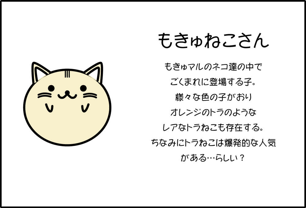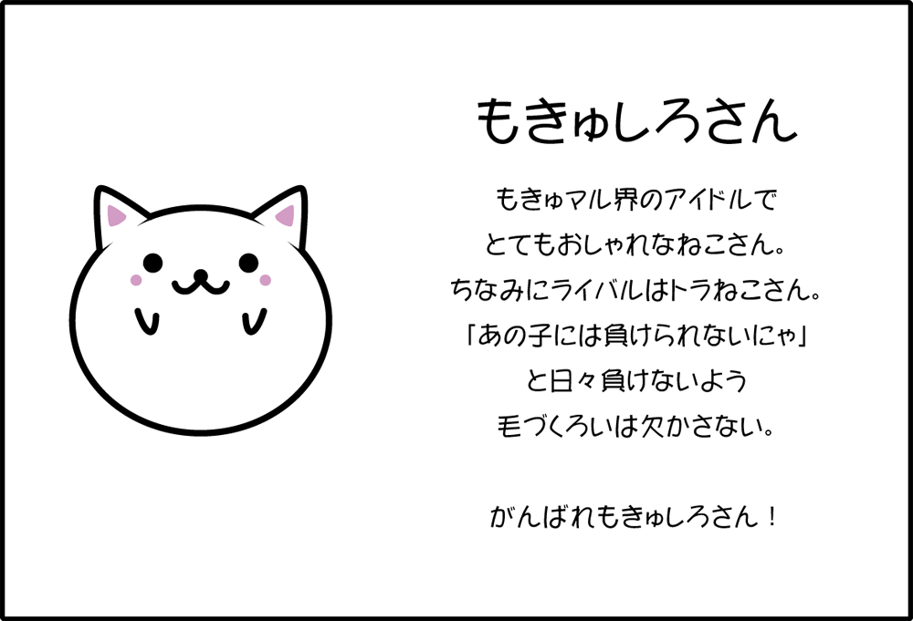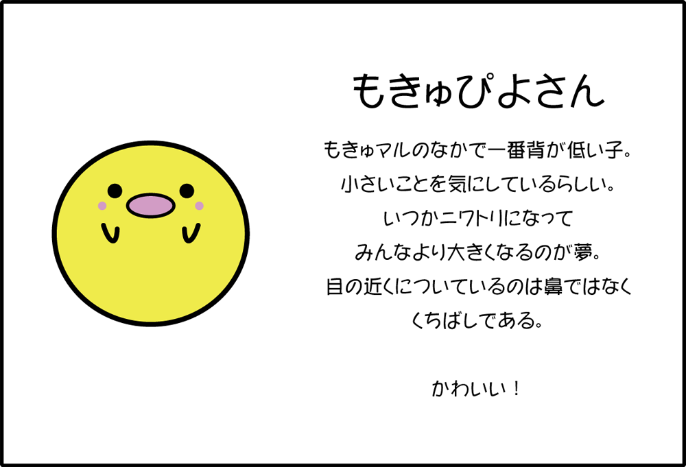 もきゅマルたちを紹介します。 イベントではこの中にはいないもきゅマルとも会える…かも?